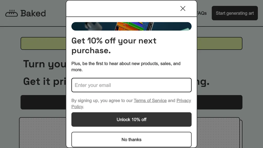 Bake is an AI tool that generates unique art from ideas and allows custom purchases online and in-person. Each creation is unique and there are no refunds or cancellations. Support is available for questions or concerns…
