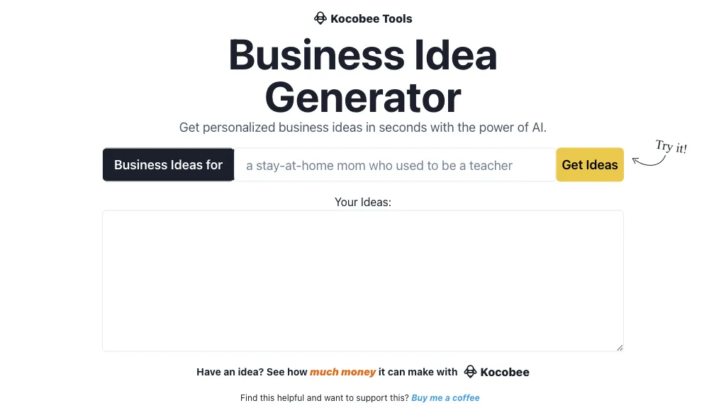 Kocobe is an AI-powered tool that generates business ideas quickly and provides a range of options in seconds. It also helps determine how much money users can make from their chosen ideas, without offering pricing infor..