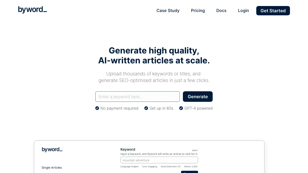 Byword is an AI content generation platform that offers image and social post creation, custom writing styles, and targeted article length options, integrated with various platforms, and includes case studies and frequen..