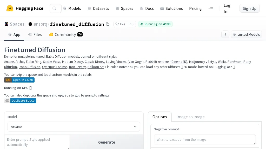 Finetuned Diffusion is a pre-trained model for text generation tasks on Hugging Face’s Space platform. It can be used in Colab without waiting in a queue…