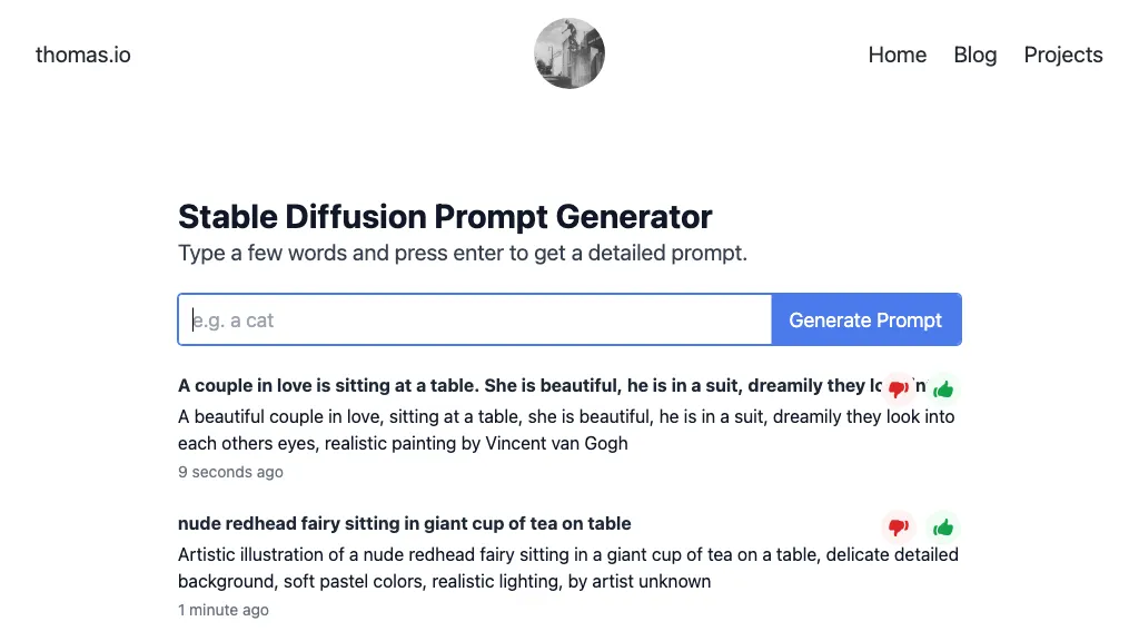 The AI tool generates visual prompts based on user input and includes a variety of themes such as couples sitting at a table, nude fairies, city walls, plants, and cartoon characters in different styles…