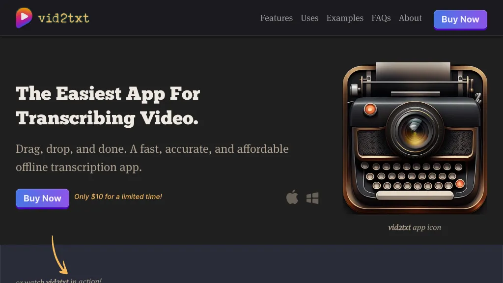 Vid2Txt is an offline transcript app that allows users to transcribe video and audio files quickly, accurately, and affordably without any monthly fees or subscription limits. It supports various file..